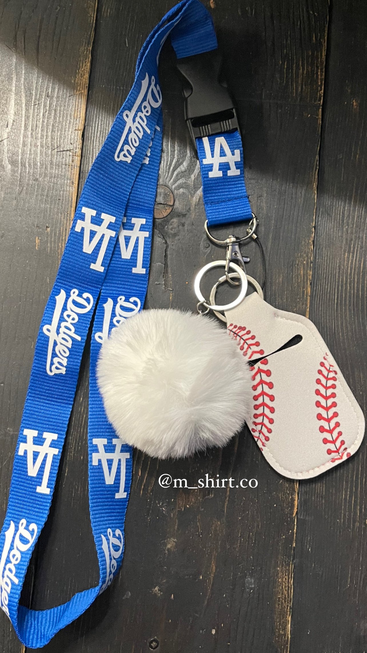 Includes, blue LA lanyard, white soft Pom keychain and baseball hand sanitizer holder.